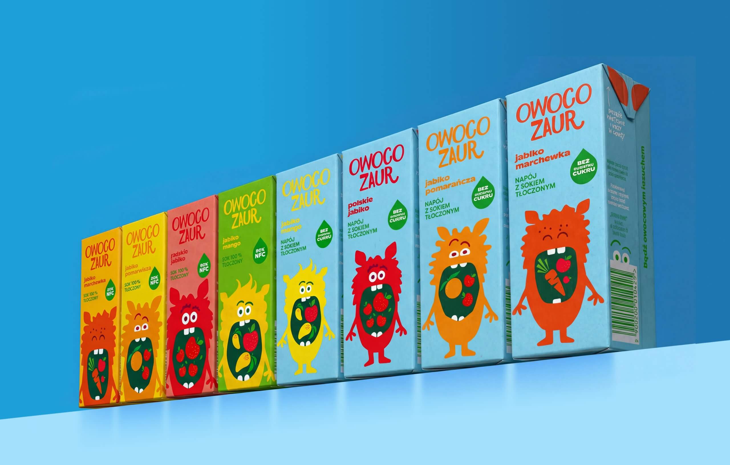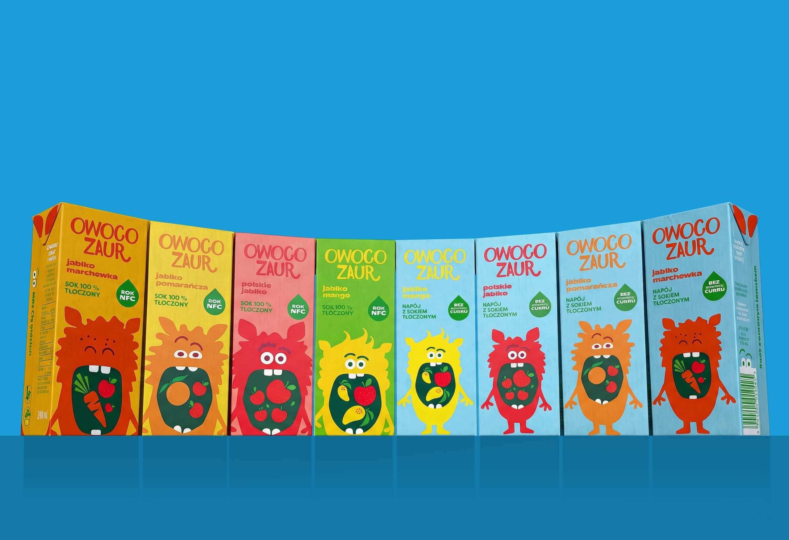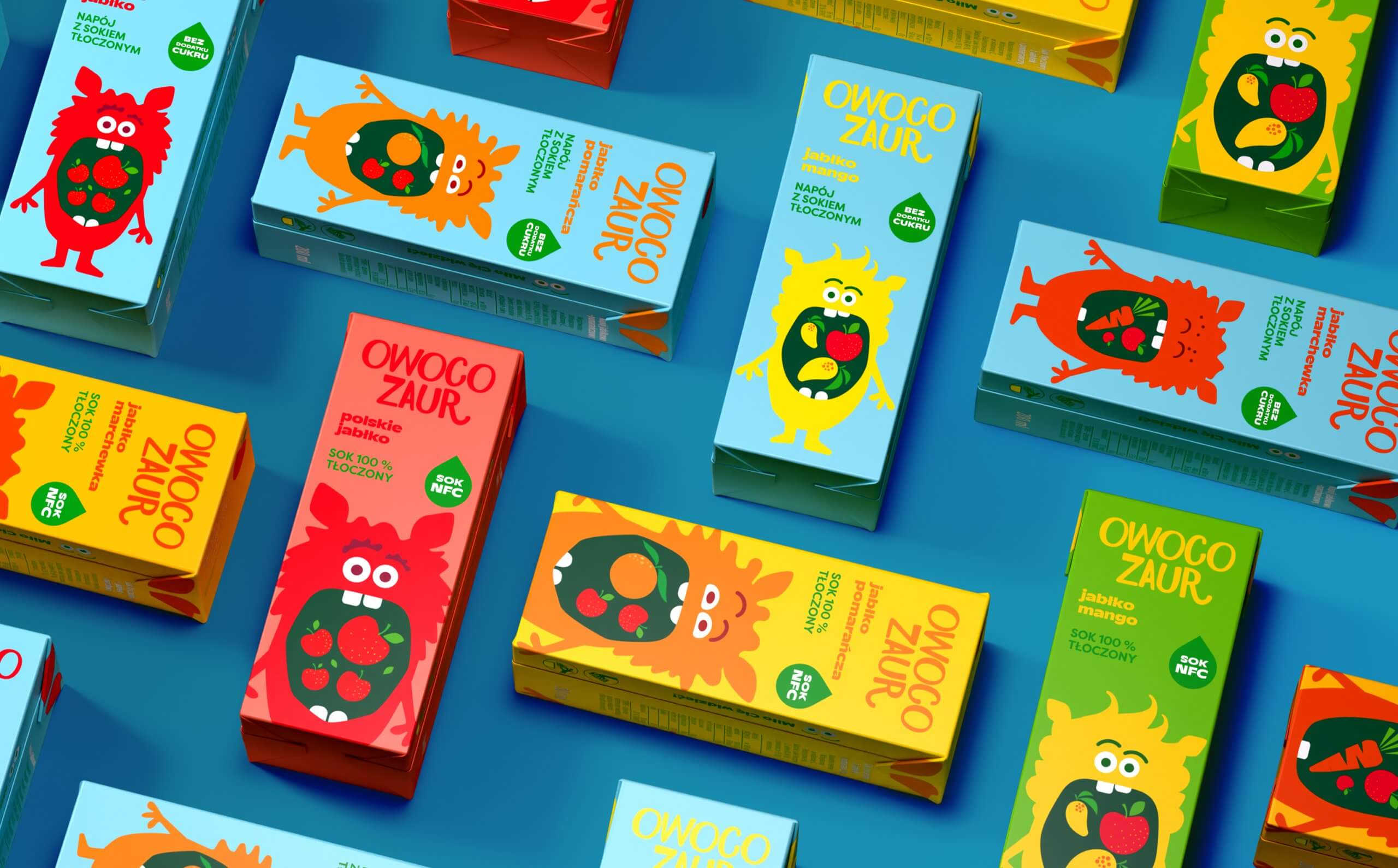 To nasza odpowiedź na zadanie postawione przez Cymes: projekt nowej marki soków NFC i napojów na bazie soków NFC bez dodatku cukru. Linia produktów została opracowana głównie z myślą o dzieciach, więc zależało nam na stworzeniu wyrazistego brand hero. Stąd narysowana przez nas postać – charakterna, oryginalna. I elastyczna, bo z dużym potencjałem narracyjnym. Na każdym smaku możemy zobaczyć innego Owocozaura, a ich wygląd i kolorystyka nawiązują do rodzaju owoców. Wizerunek całej linii? Niekoncernowy. Bardziej kraftowy. Pełen bardzo naturalnych emocji.